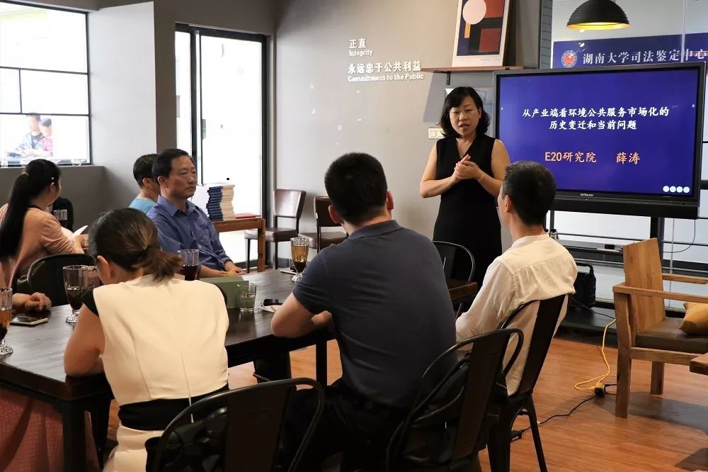 与E20环境平台的合作共赢,湖南大学MPA学术午餐会在法学楼咖啡厅举行。本次会议交流的主题为“从产业端看环境公共服务市场化的历史变迁和社会问题”,由E20研究院执行院长薛涛做主题分享,左健教授主持,李连友院长、E20环境平台高级合伙人汤浩以及公管学院多位老师参与交流。