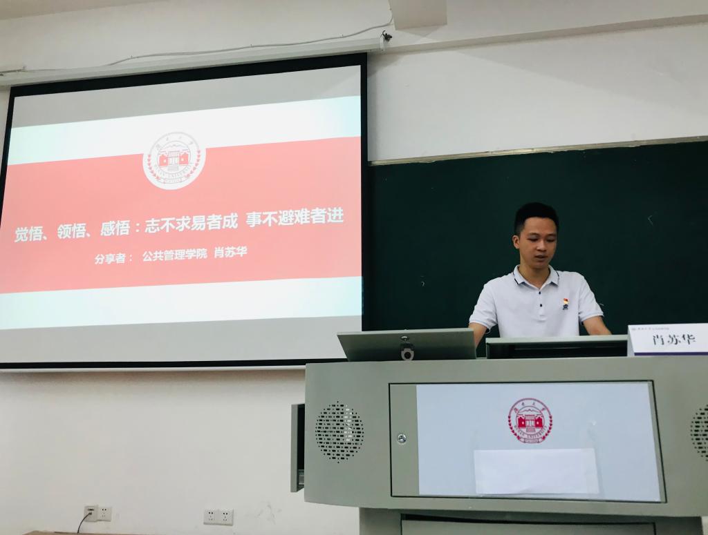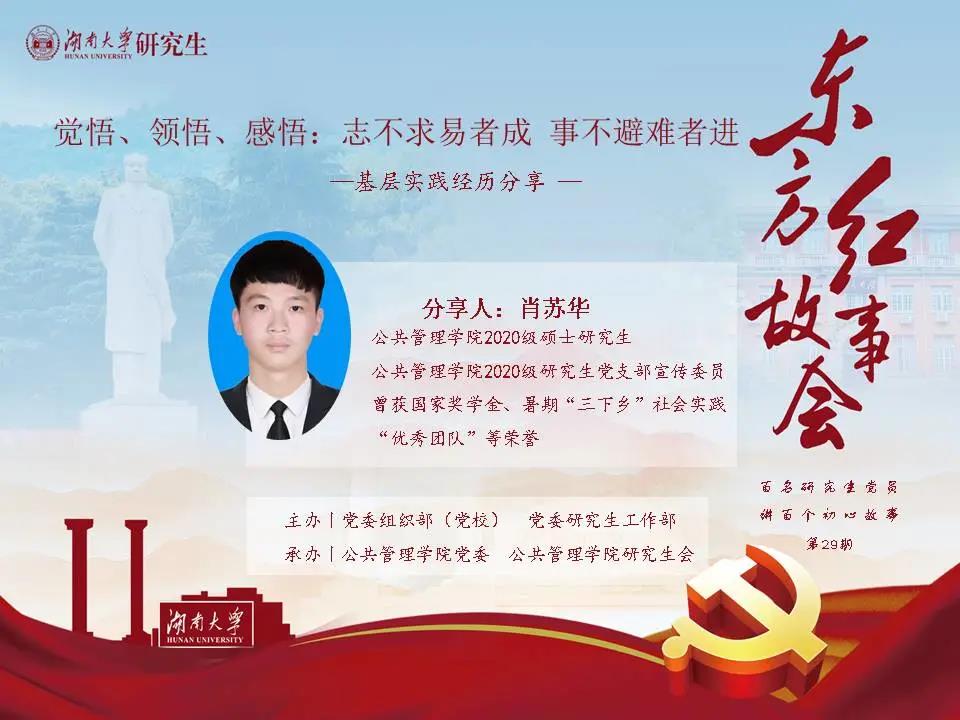6月24日下午15:30,湖南大学优秀研究生“东方红故事会”第29期在法学楼304教室举行,公共管理学院2020级硕士研究生党支部宣传委员肖苏华就入党初心与基层实践经历进行了分享,公共管理学院全体研究生党员参加。