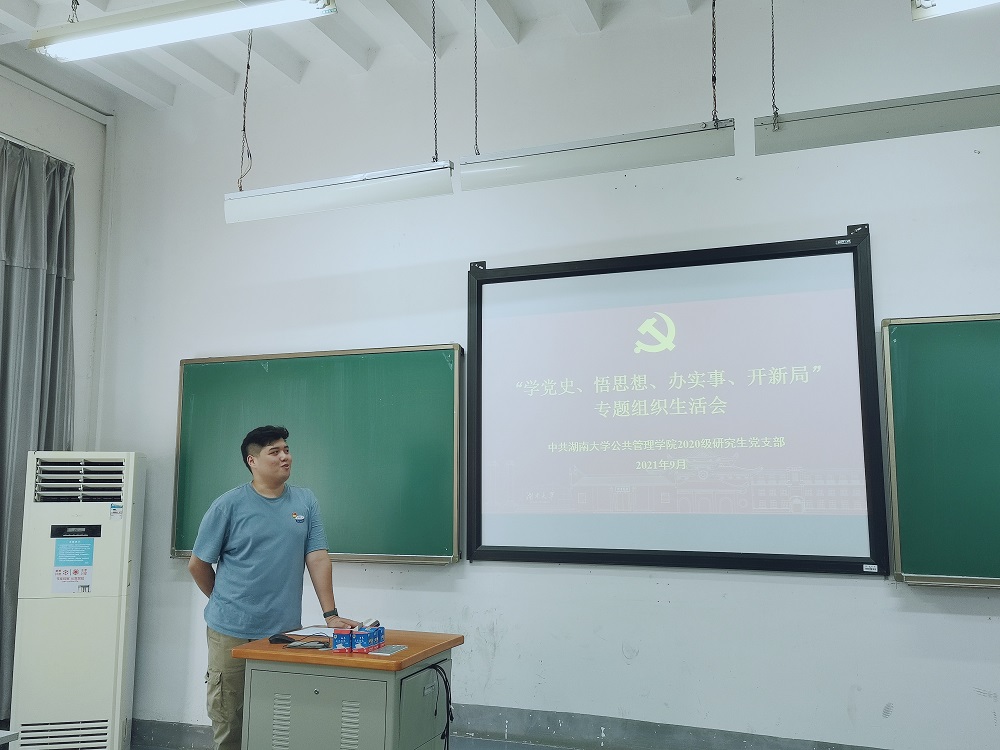 为提升基层党组织的组织力,推动党史学习教育高质量开展,激励学生党员从党的光辉历史中汲取砥砺奋进的精神力量,2021年9月10日下午,公共管理学院2020级研究生党支部于南校区东楼214室顺利召开“学党史、悟思想、办实事、开新局”专题组织生活会,学院党委书记付蓉芬列席会议并作点评发言。本次组织生活会由2020级研究生党支部书记王浩主持,支部全体党员参加。