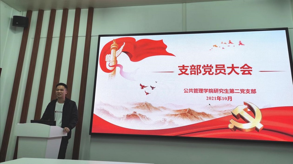 为了深入学习习近平总书记在庆祝中国共产党成立100周年大会上的重要讲话精神,引导党员同志传承红色基因、赓续红色血脉,2021年10月25日晚,公共管理学院硕士研究生第二党支部在院楼221室召开预备党员转正大会暨伟大建党精神专题学习。本次会议由党支部书记肖苏华主持,支部全体党员参加。