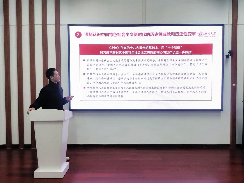 支部书记肖苏华作党的十九届六中全会精神专题宣讲,他指出党的十九届六中全会是在我们党百年华诞重要时刻和“两个一百年”奋斗目标历史交汇关键节点召开的重要会议,要深刻领悟总结党的百年奋斗重大成就和历史经验的重要意义,在新征程起点上,继承好和弘扬好伟大建党精神,埋头苦干、勇毅前行,努力学好专业本领,积极投身社会实践,为实现中华民族伟大复兴的中国梦贡献湖大力量和公管智慧。