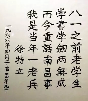参加南昌起义,成为徐特立加入中国共产党后,在艰苦漫长的革命征途中迈出的第一步。1966年4月,徐特立重访起义旧址,挥笔题诗一首: