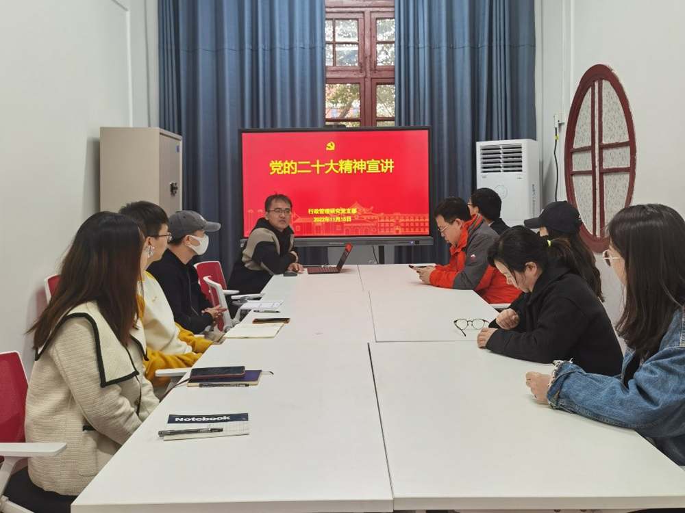 2022年11月15日下午,行政管理研究党支部召开党员大会,专题学习党的二十大会议精神,支部书记赵岩领学。