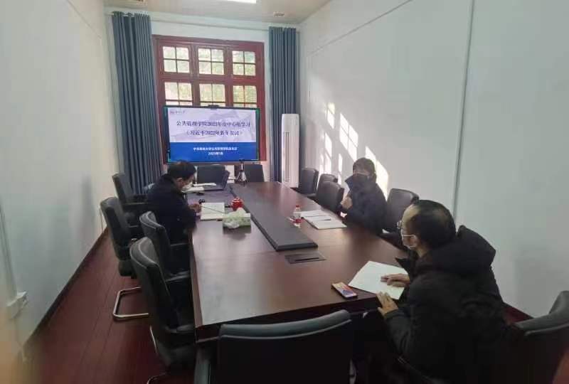 2023年1月4日上午,公共管理学院党委中心组开展今年第1次理论学习,学习采取线上线下相结合的方式进行。院党委书记付蓉芬主持学习,院长李连友及学院中心组全体成员参加学习。