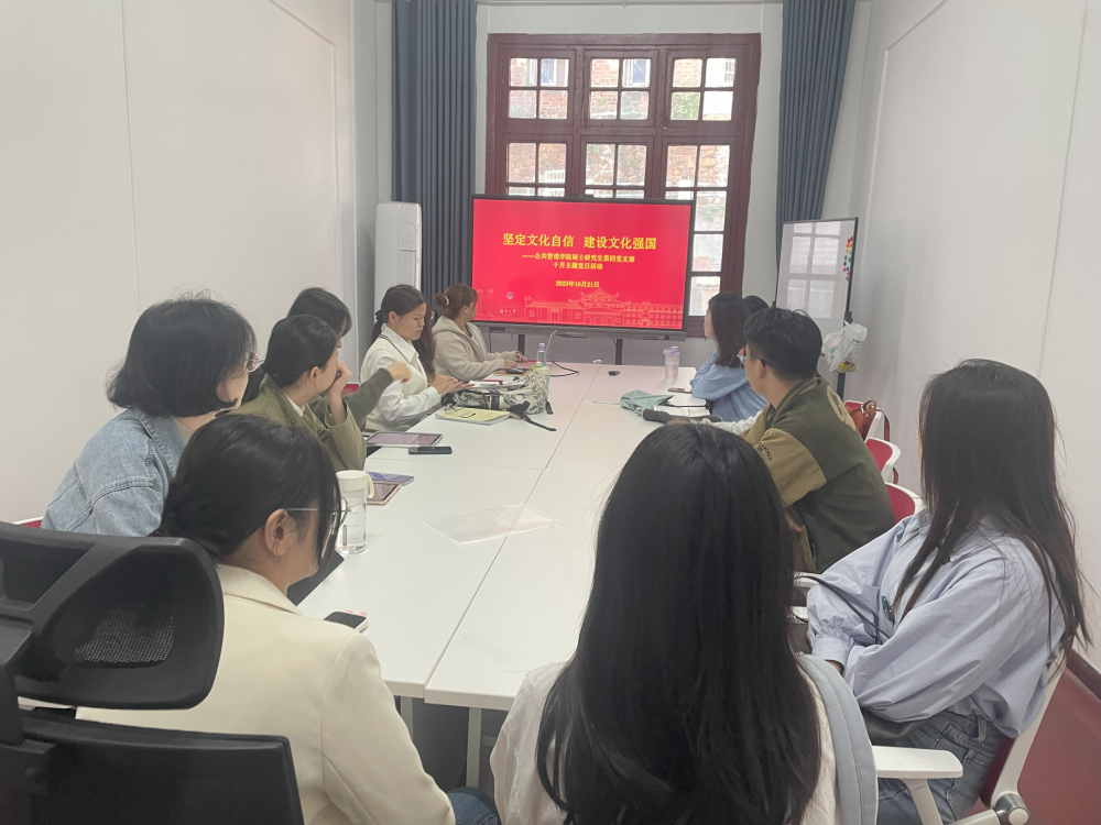 10月21日下午,公共管理学院硕士研究生第四党支部在学院214室开展主题党日活动暨“坚定文化自信 建设文化强国”党课学习,会议由支部书记何思缤主持。此次会议吸收了入党积极分子听党课。