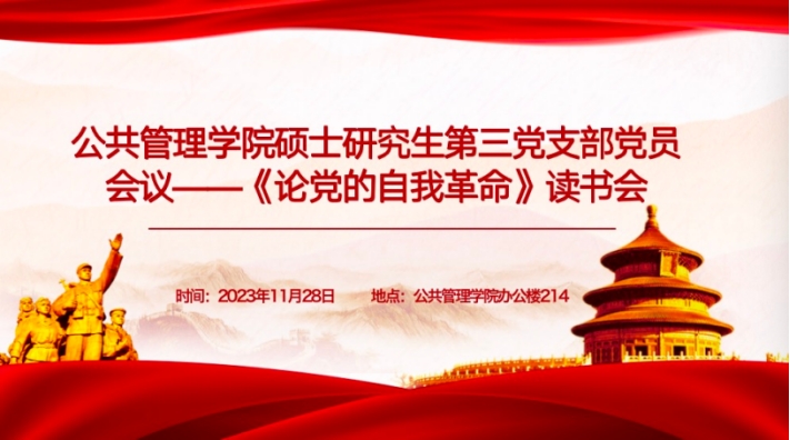 10月8日,公共管理学院硕士研究生第三党支部在学院214室开展主题党日活动,深入学习了《论党的自我革命》一书,并积极探讨如何在“十四五”发展规划中充分发挥党员的先锋模范作用。会议由支部书记刘昱呈主持,支部党员积极参加。