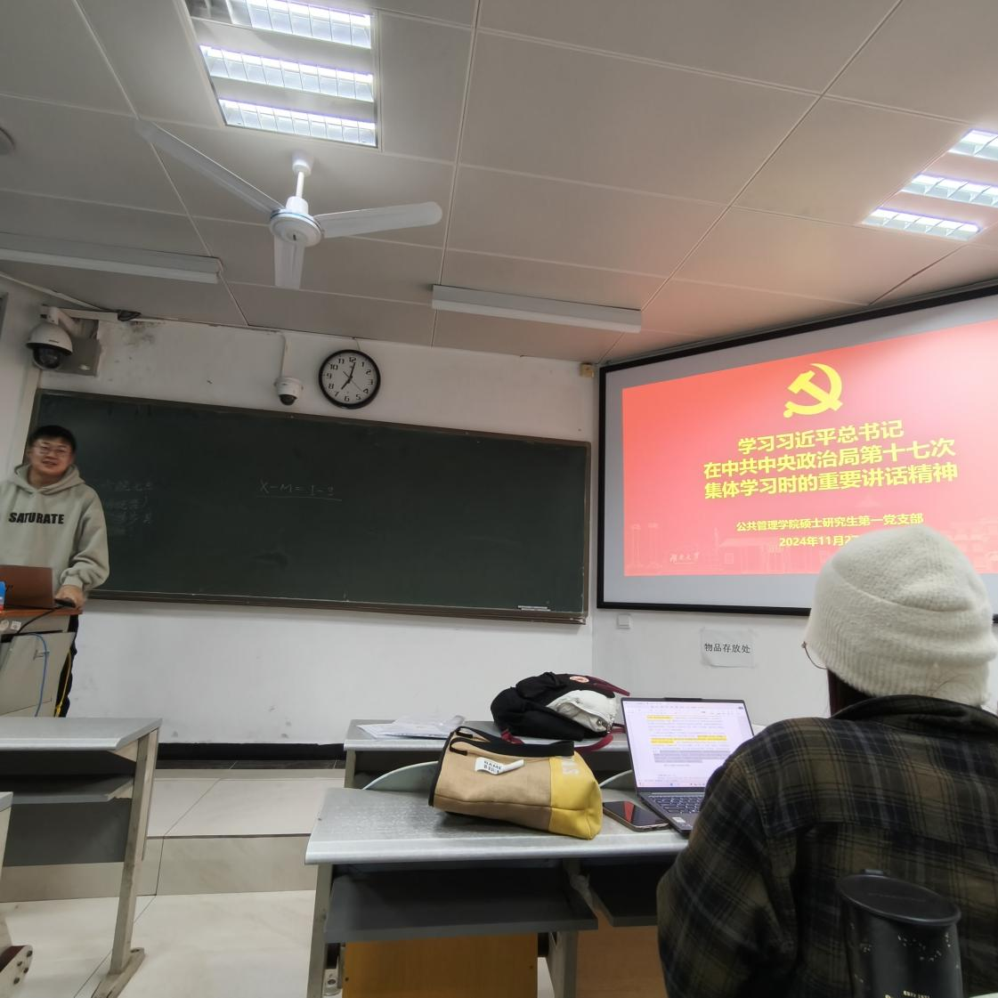 为深入学习习近平总书记在二十届中共中央政治局第十七次集体学习上的重要讲话精髓,提升党员思想认识,公共管理学院硕士研究生第一党支部于11月27日在水教206召开党员大会进行党课学习,并开展讨论接收预备党员相关事项,会议由支部书记于竞男主持。