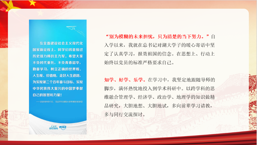 支部副书记胡晗同志以“党的光辉照我心,青春奋斗正当时”为主题进行了国家奖学金获得经验分享。胡晗同志首先带领大家回顾了习近平总书记2020年在湖南大学考察时的重要讲话。强调自己在总书记对湖大学子的暖心寄语中坚定了认真学习,报效祖国的信念,并在在思想上、行动上始终以党员的标准严格要求自己。接着,他从多和师友交流、跨学科知识积累、多参加学术会议和学科竞赛、如何开展合作和如何面对挫折等方面进行分享。他指出科研之路不可能是一帆风顺的,更多的是一波多折。但他始终坚信办法总比困难多,只要脚踏实地,勤于思考,不断总结经验、吸取教训,必然克服困难。