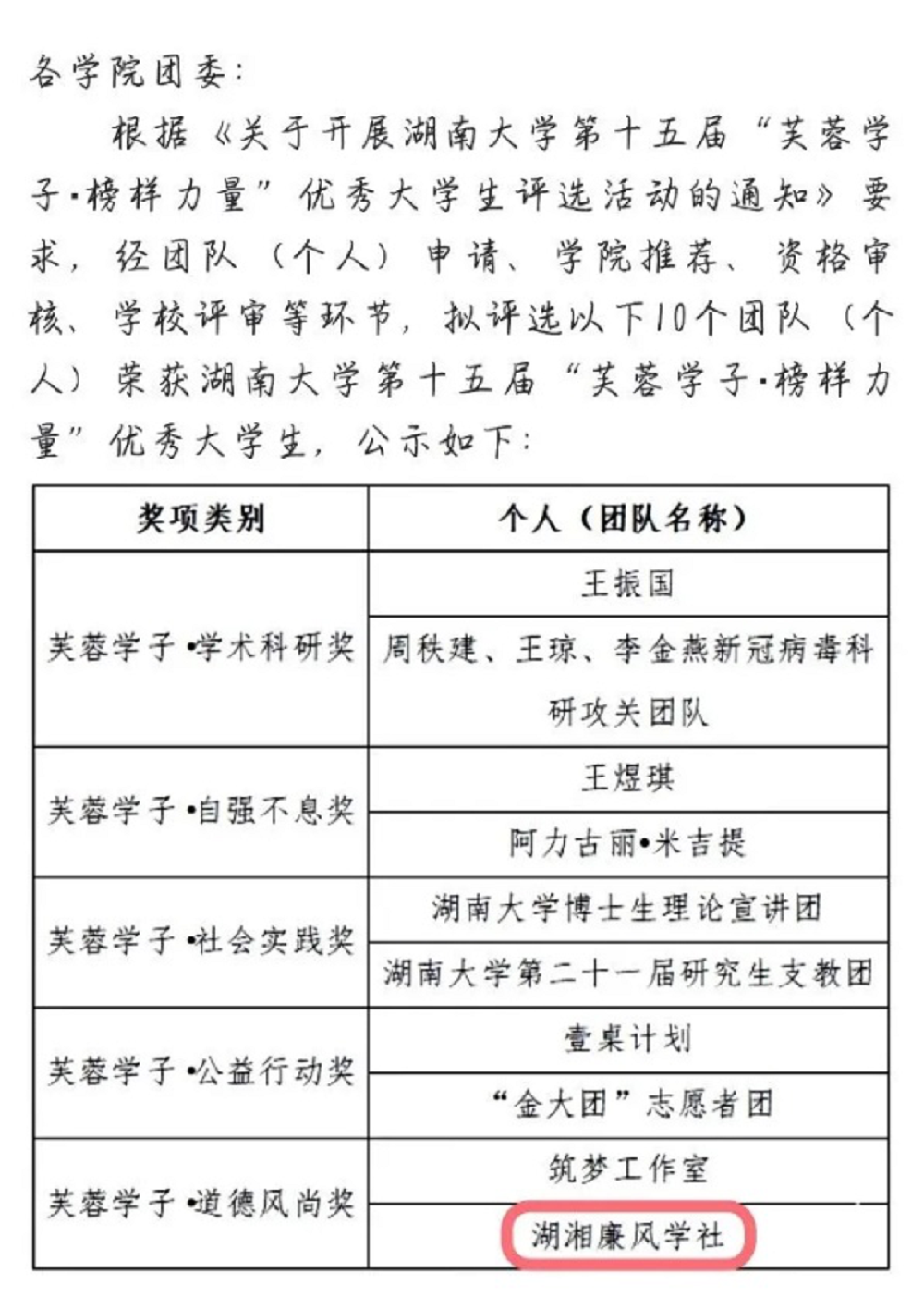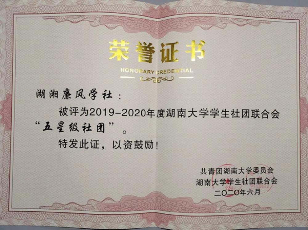 这一年,湖湘廉风学社亦获得了多项荣誉:在湖南大学第十五届“芙蓉学子·榜样力量”评选活动中湖湘廉风学社荣获“芙蓉学子·道德风尚奖”;荣获湖南大学校级学生社团联合会“精品活动”和“五星级社团”荣誉称号;在首届湖南大学融媒体作品大赛中,湖湘廉风学社费梓萱、段瑞洋等社员的作品《廉洁disco》获得了优秀作品二等奖;第十届湖湘廉风学社社长费梓萱荣获2020年湖南大学学社联“十大风云人物”荣誉称号。
