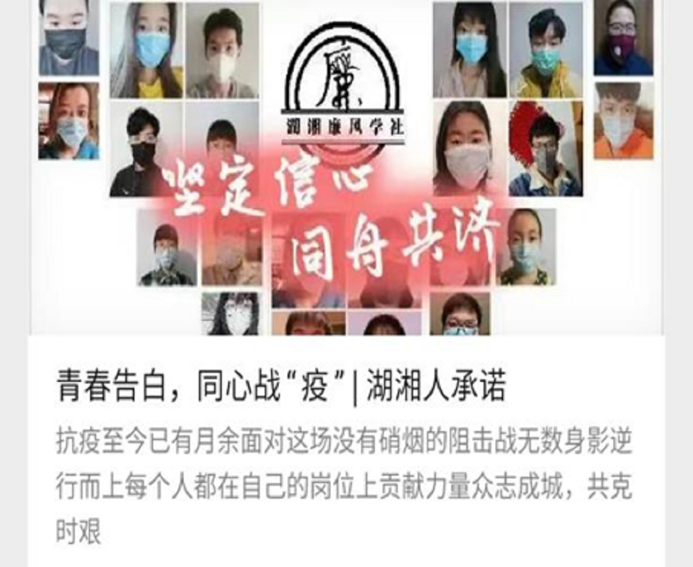在防控疫情的背景之下,学社于2020年3月至4月举办了“青春告白、同心战‘疫’”系列活动,组织社员开展了居家生活展示、宅家正能量打卡、线上观看廉洁纪录片等活动。湖湘廉风学社社员发挥自身能量,积极参与到各种形式的抗疫活动之中。其中费梓萱等多名同学参与组织为战“疫”一线医护人员子女开展线上学业辅导的“壹桌计划”;方晶同学第一时间响应社区号召,积极参与社区防疫巡防志愿工作;央金同学在西藏老家翻译、分发抗疫志愿服务手册,宣传防疫知识,其相关事迹被中华全国学联报道。