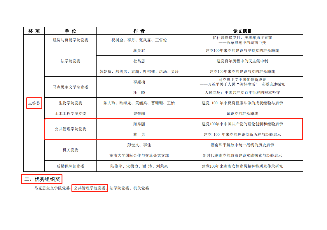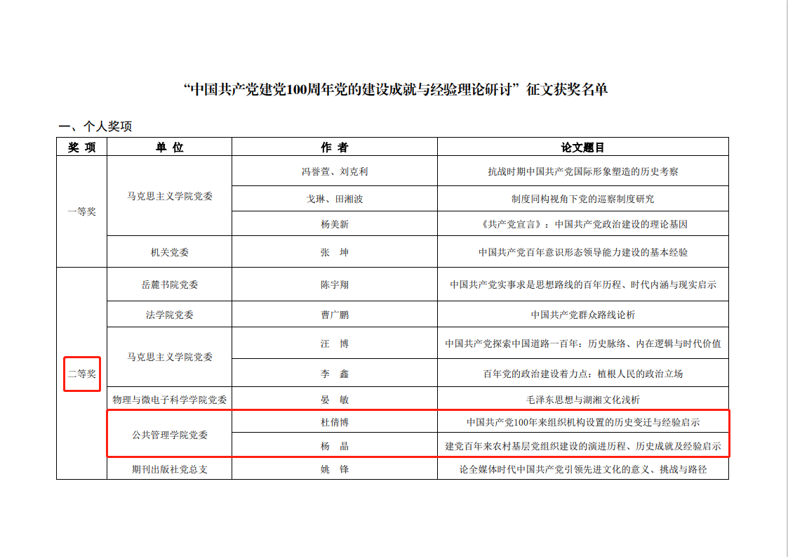 2021年4月23日,由湖南大学党委组织部(党校)主办的庆祝“中国共产党建党 100 周年党的建设成就与经验理论研讨”征文活动公布了获奖作品名单,日本av女优