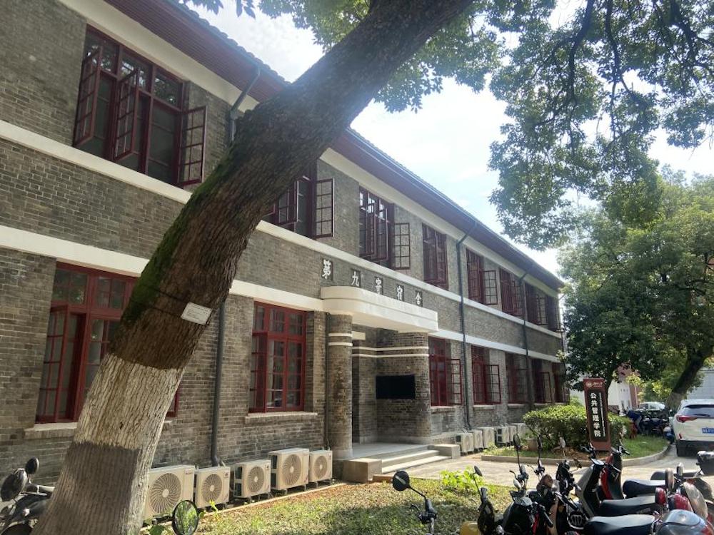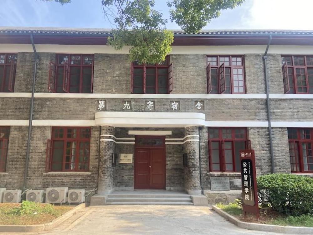 办公楼原为湖南大学第九学生寄宿舍,由著名建筑学家、湖南大学教授柳士英设计,建成于1946年。那时正值抗日战争结束后不久,湖南大学校舍遭到日本侵略者的轰炸、焚烧,损失惨重,柳士英带领一帮师生自力更生,设计建造了一批宿舍,其中就包括第九学生寄宿舍。该建筑紧邻岳麓山脚,南边是一处空坪与绿化地面,周边绿化以大型樟树、散尾葵、冬青、丛植金叶女贞为主,环境幽静、风景宜人,是读书治学的好地方。2013年,被国务院批准为第七批全国重点文物保护单位。