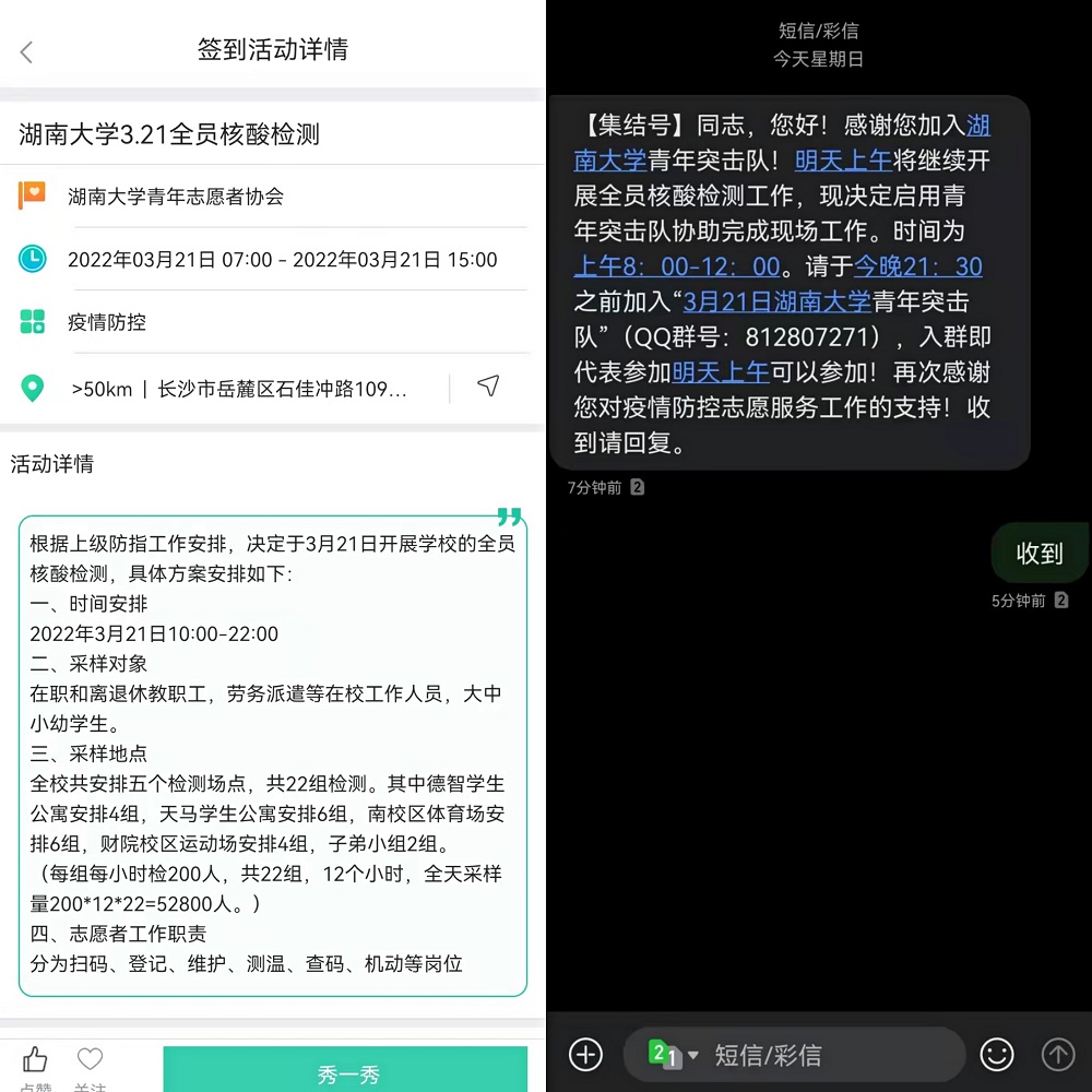 事迹7:公共管理学院2020级博士研究生李启瑄报名参加湖南大学青年突击队。疫情期间积极响应号召参加疫情防控志愿服务工作,在德智公寓园区以及南校区体育场协助现场核酸检测工作、主要负责检查健康码、维护现场秩序等,为疫情防控贡献自己的微薄力量。