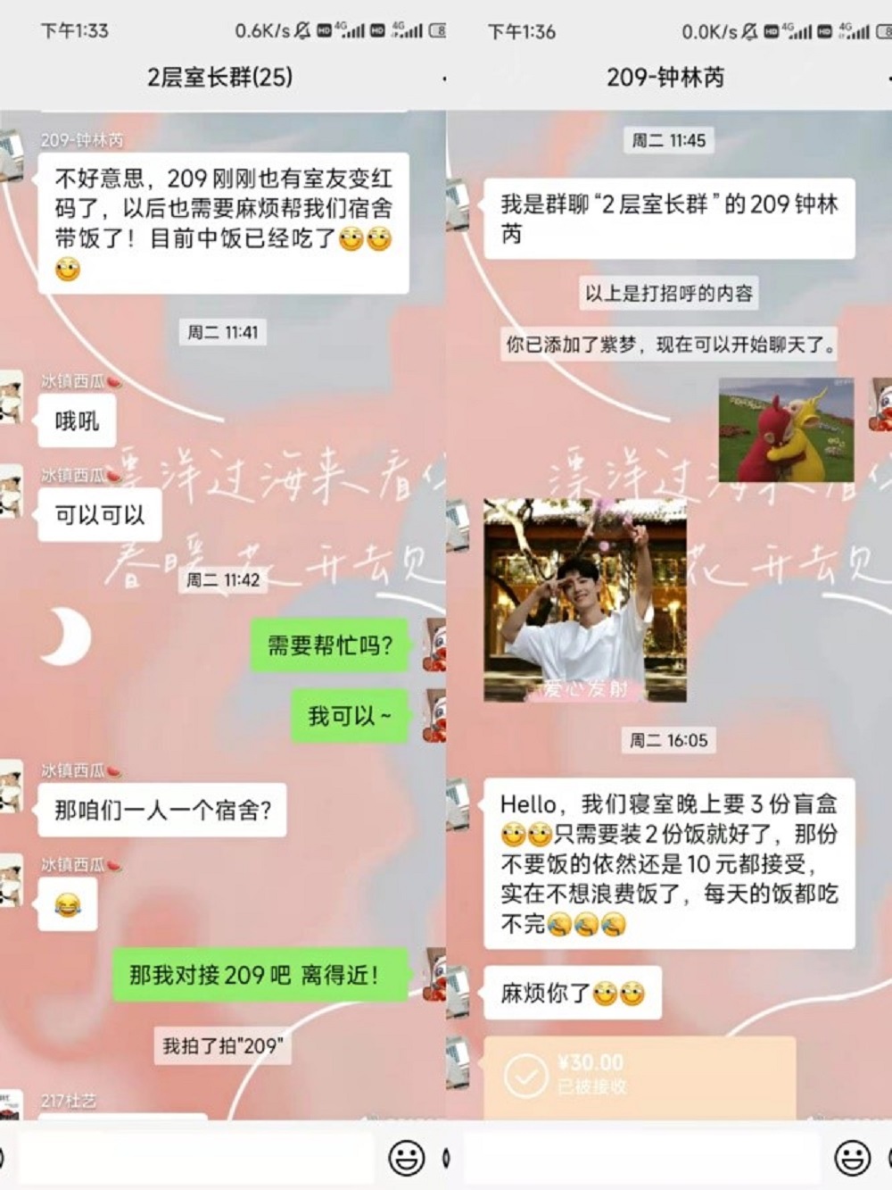 事迹4:公共管理学院2020级硕士研究生彭海、马鉴、师祯晨同学志愿负责所在楼层三个红码黄码寝室,三餐带饭工作。