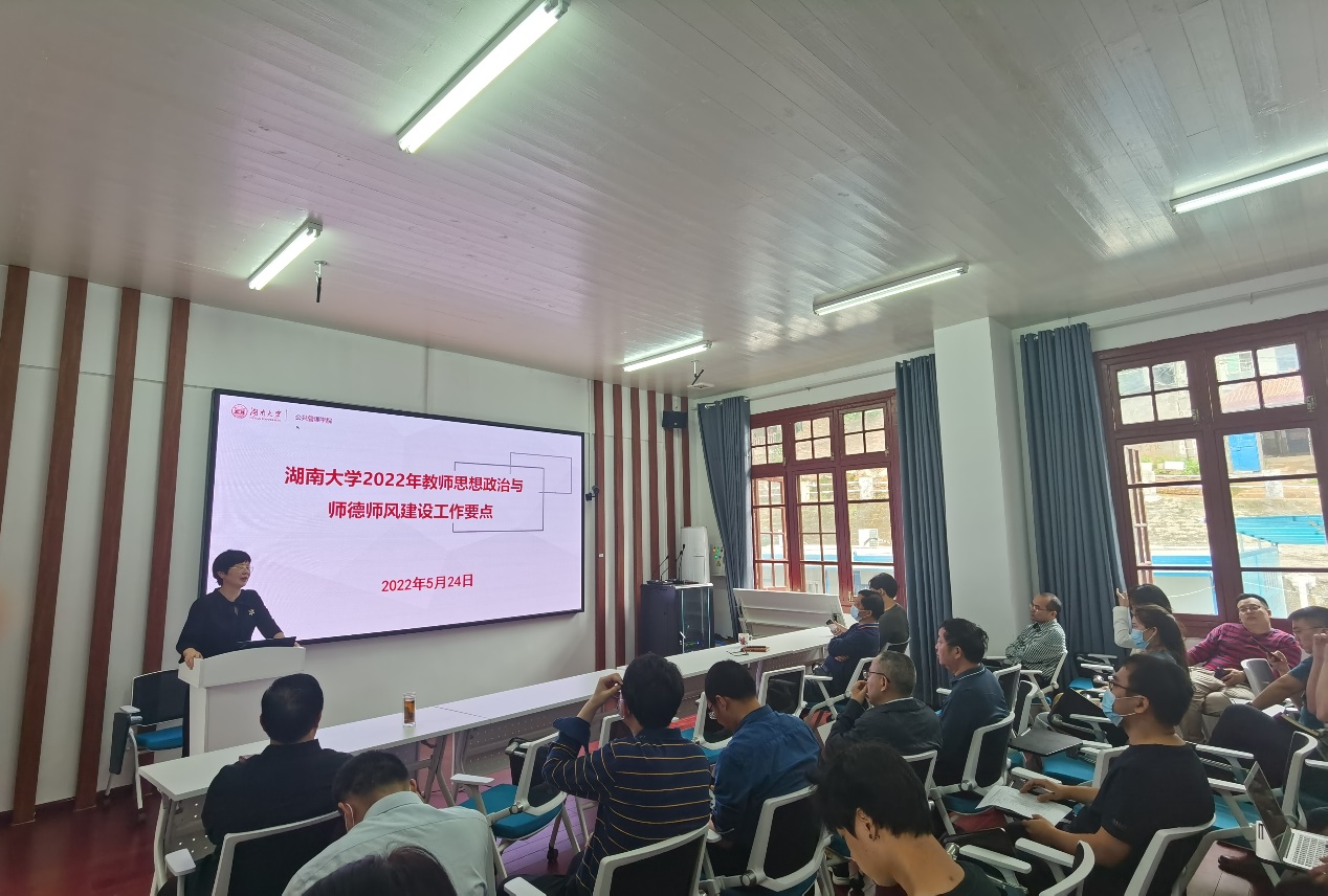 5月24日,公共管理学院召开全体教职工会议,深入学习《湖南大学2022年教师思想政治与师德师风建设工作要点》精神,文件由党委书记付蓉芬领学。