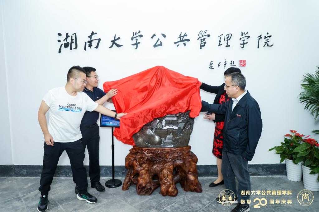 在学院门厅夏书章先生题字前,付蓉芬书记、李金龙教授与2004级研究生校友代表刘明然、2001级本科生校友代表张俊峰共同为“岳阳楼记”菊花石揭彩。刘明然表示,“岳阳楼记”菊花石雕刻蕴含的忧国忧民情怀与公共管理学院人才培养理念比较一致,捐赠菊花石表达的是校友对学院培养成才的深厚感激之情,也代表着校友对学院未来发展的支持和祝愿,希望学院能够在人才培养和学科发展方面再上新台阶。
