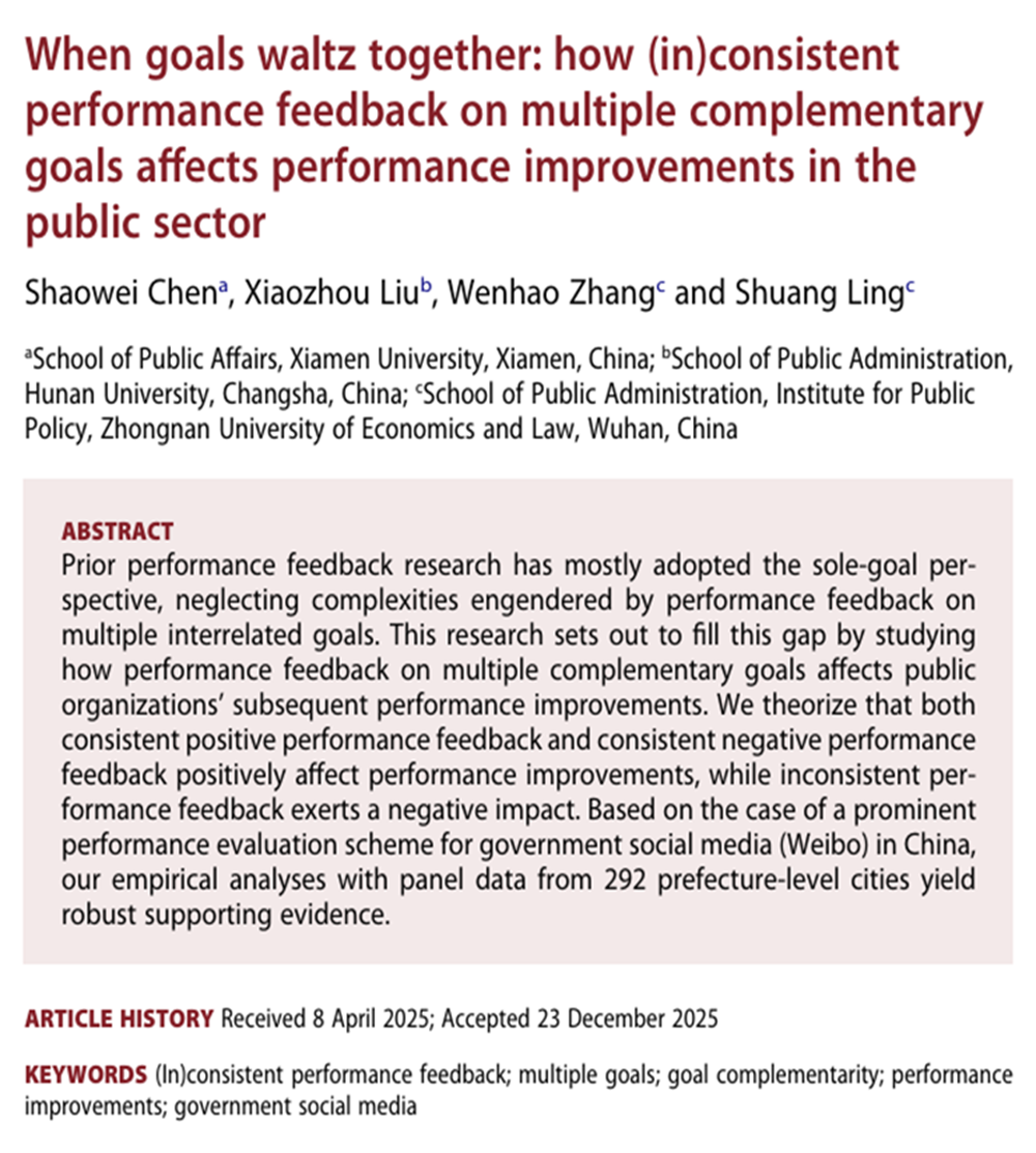 博士生刘小舟(共同通讯作者、第二作者)与厦门大学公共事务学院陈少威教授、中南财经政法大学公共管理学院硕士生章文浩、凌双副教授合作的论文“When goals waltz together: how (in)consistent performance feedback on multiple complementary goals affects performance improvements in the public sector”(《当目标共舞:多重互补目标的绩效反馈(不)一致性如何影响公共部门的绩效改进》)于国际权威期刊Public Management Review在线发表。该刊是国际公共管理研究学会(IRSPM)的旗舰期刊,影响因子为4.9,在90本公共管理类国际期刊中位列第五,在政治学、公共政策与公共管理领域享有崇高声誉。
