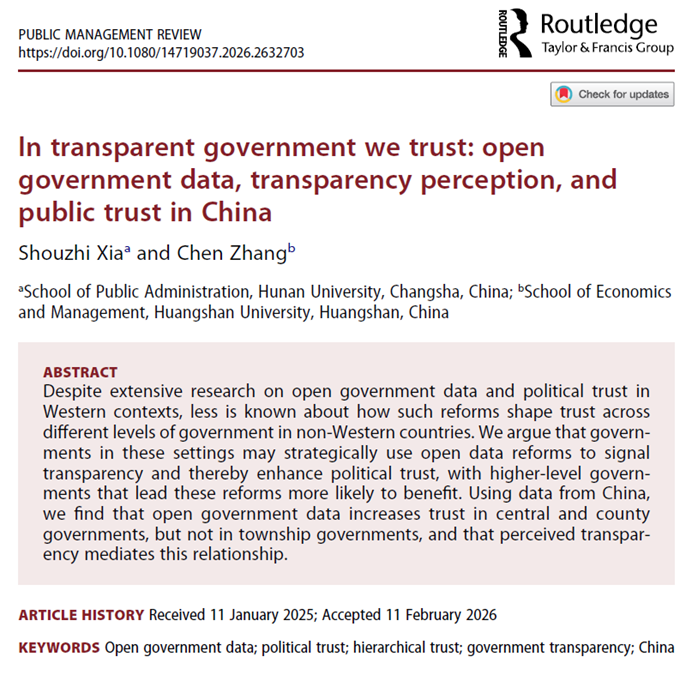 教师夏守智(第一作者)与黄山学院经济管理学院张琛老师合作完成的论文“In transparent government we trust: open government data, transparency perception, and public trust in China”(《我们信赖透明政府:开放政府数据、透明度感知与公众信任》)在公共管理权威期刊《Public Management Review》在线发表。该刊是国际公共管理研究学会(IRSPM)的旗舰期刊,在公共管理与公共政策领域享有较高影响力。