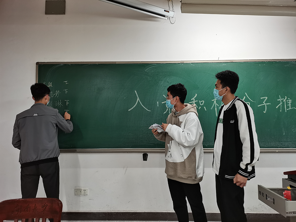 投票完毕后,高晓蕾同学收齐选票,高泽群同学唱票,曹晨葳同学计票,钟定胜同学监票。在全场同学的共同监督下,最终,景毅、王洁芳、张夏琳、高巧云、程欣怡、杨乔蕾六位同学被推选成为入党积极分子。